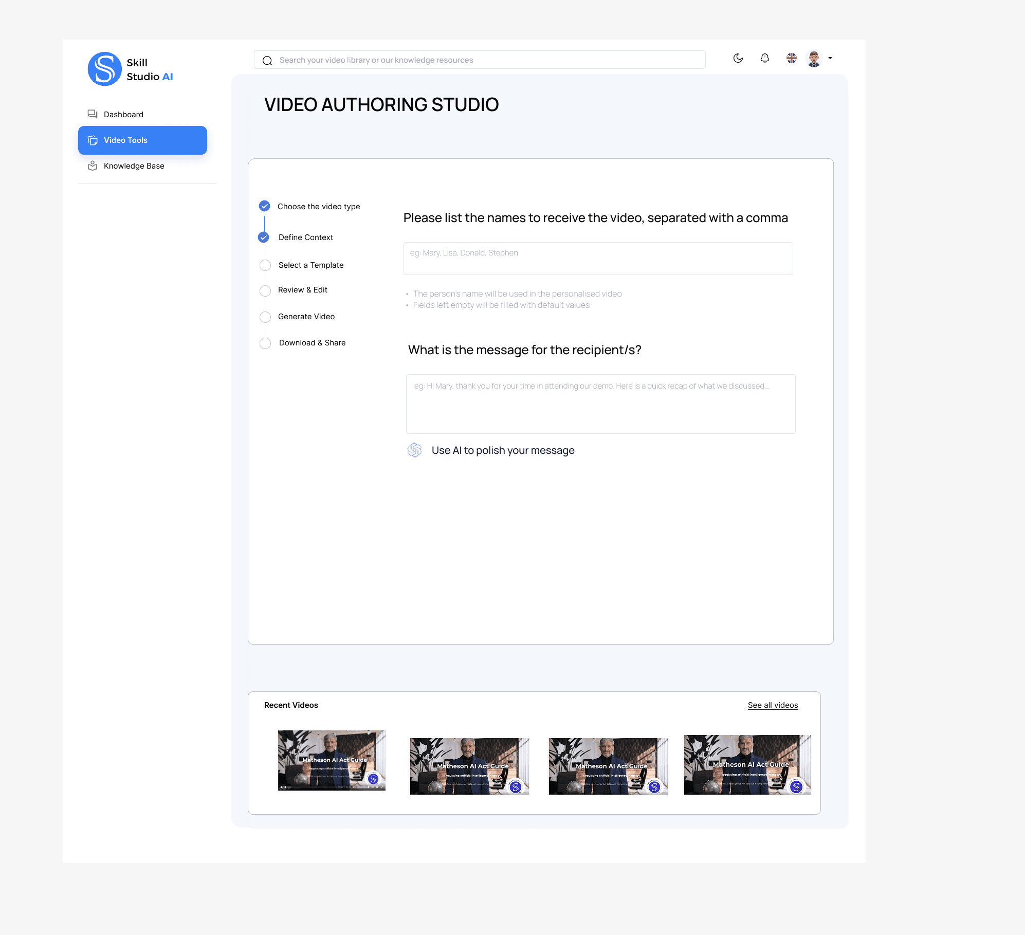 Skill Studio AI is a text-to-video generation platform for creating short, engaging videos using synthetic voice, graphic animations, and narrated videos. We specialize in compliance training, helping Learning & Development teams in financial services across the UK and Ireland. Our platform provides a no-code interface that turns text files into ready-to-publish training videos in under 5 minutes in 100+ languages. The process is simple: users upload a PDF, choose a template, and the platform generates a branded video narrated by a synthetic voice with an avatar, accompanied by learner quizzes.