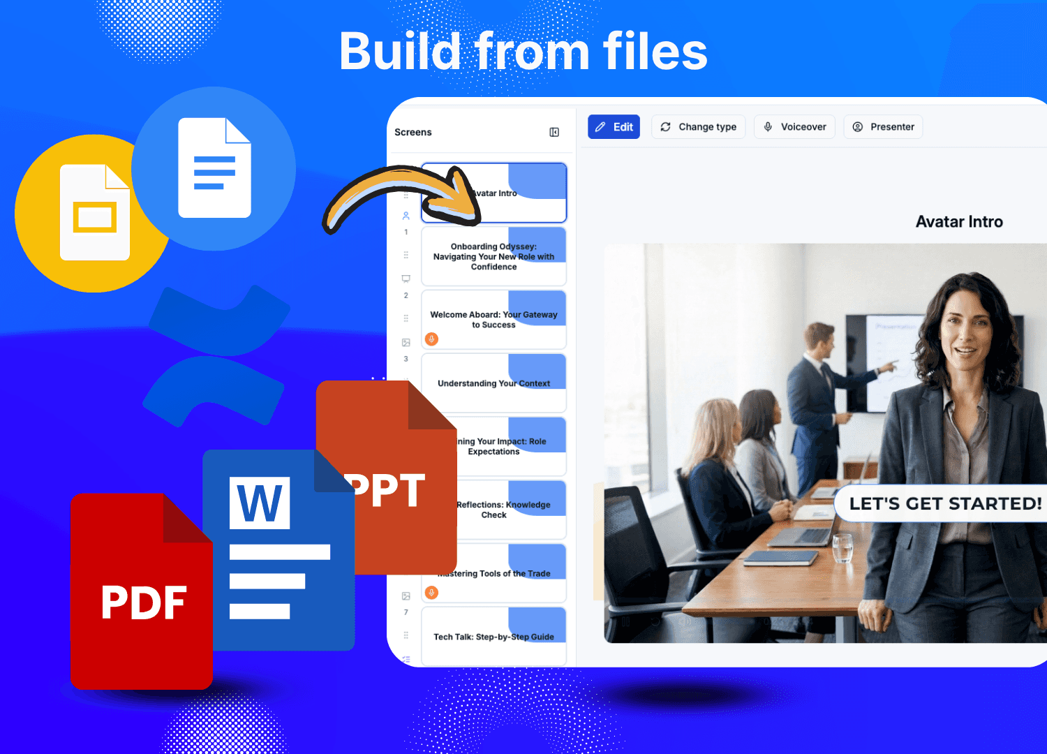 Step 2: Generate courses with AI. Each course is built from your source material: video lessons with AI avatars (700+ stock avatars, or clone your own voice), interactive quizzes, scenario questions, flip cards, video hotspots, fill-in-the-blank exercises, and certificates. 20 content block types, all generated in minutes — not weeks.