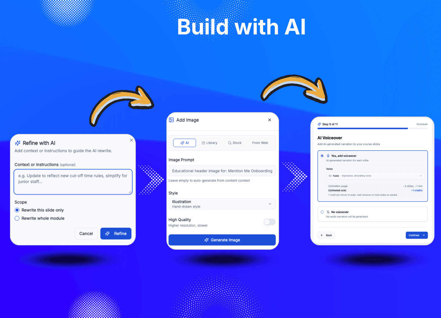 Day 2: Course generation. Upload to Skill Studio AI. Use "Build with AI" to generate your first 3–5 courses. Edit, refine, add your brand voice. Generate quizzes and certificates.