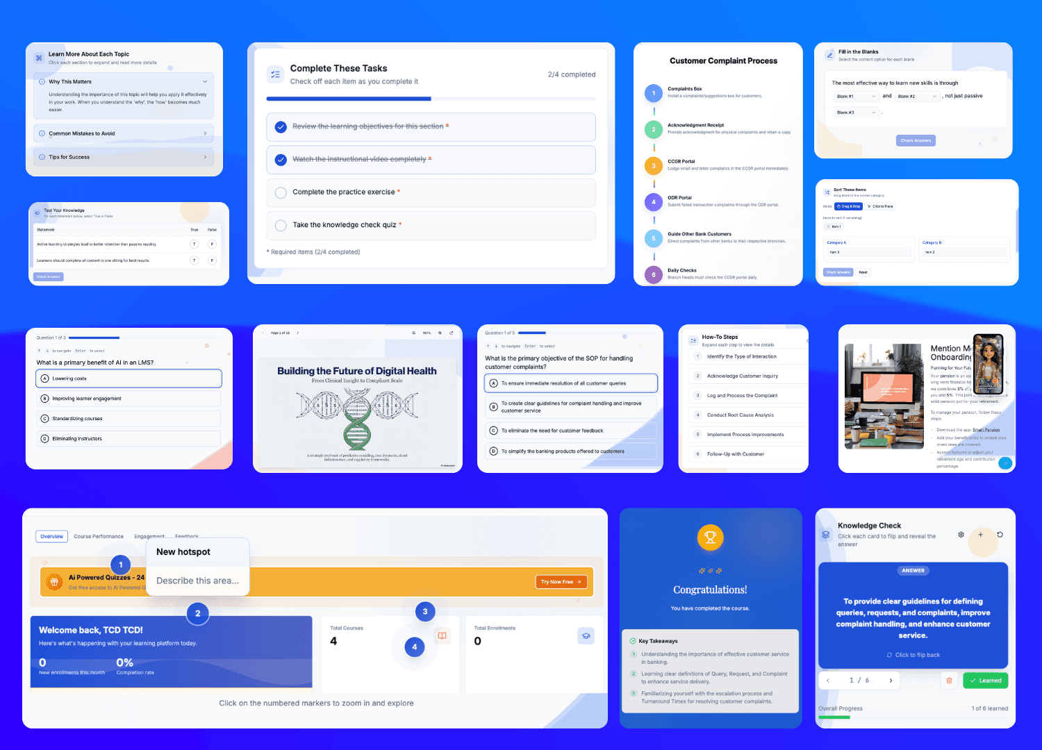 20 interactive content block types. Scenario branching, video hotspots, image hotspots, interactive flashcards, card sorting, checklists, how-to steps, expandable info panels, carousels, fill-in-the-blank, true/false, and certificates — all built into the authoring experience. No plugin. No external tool.