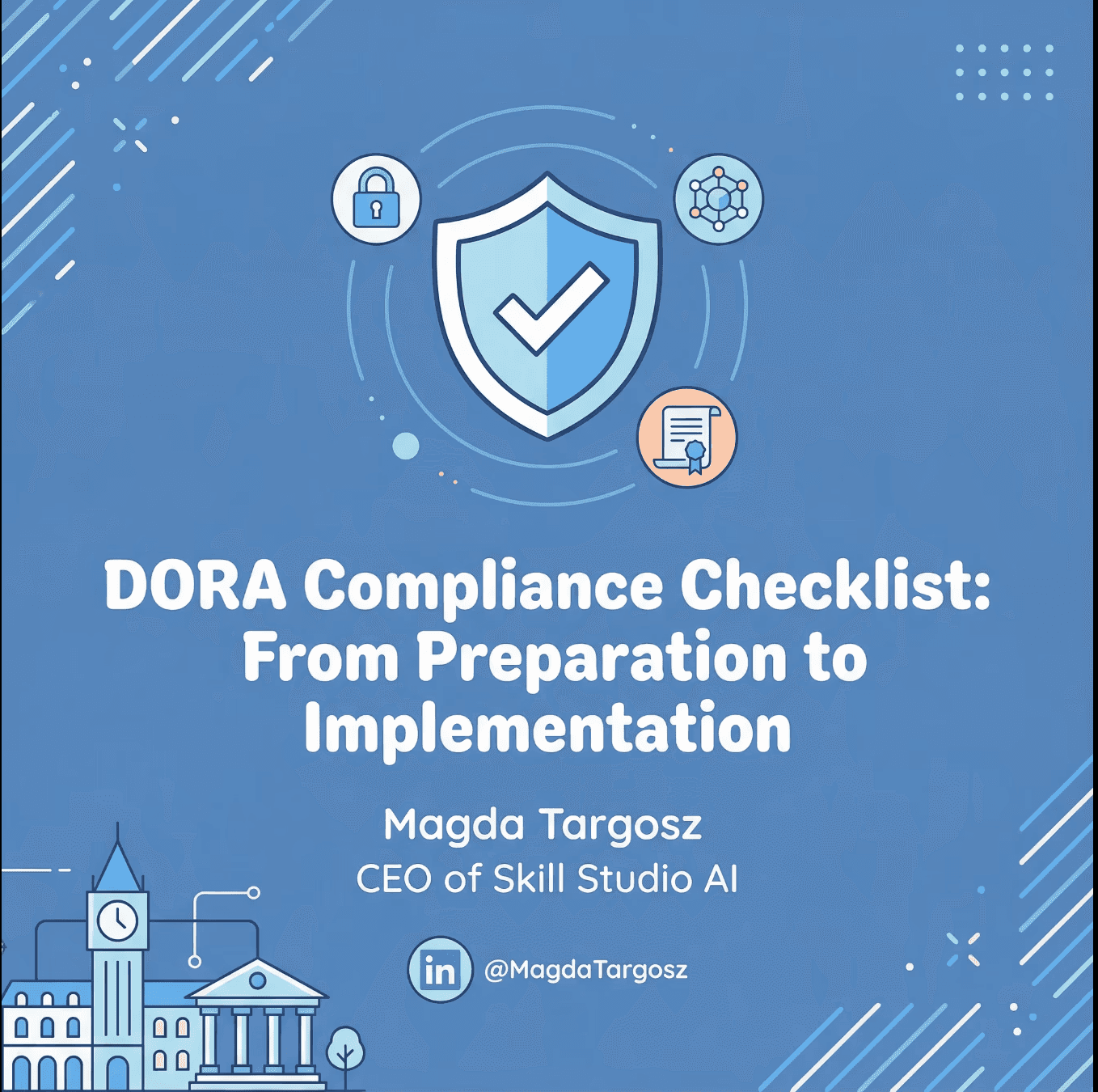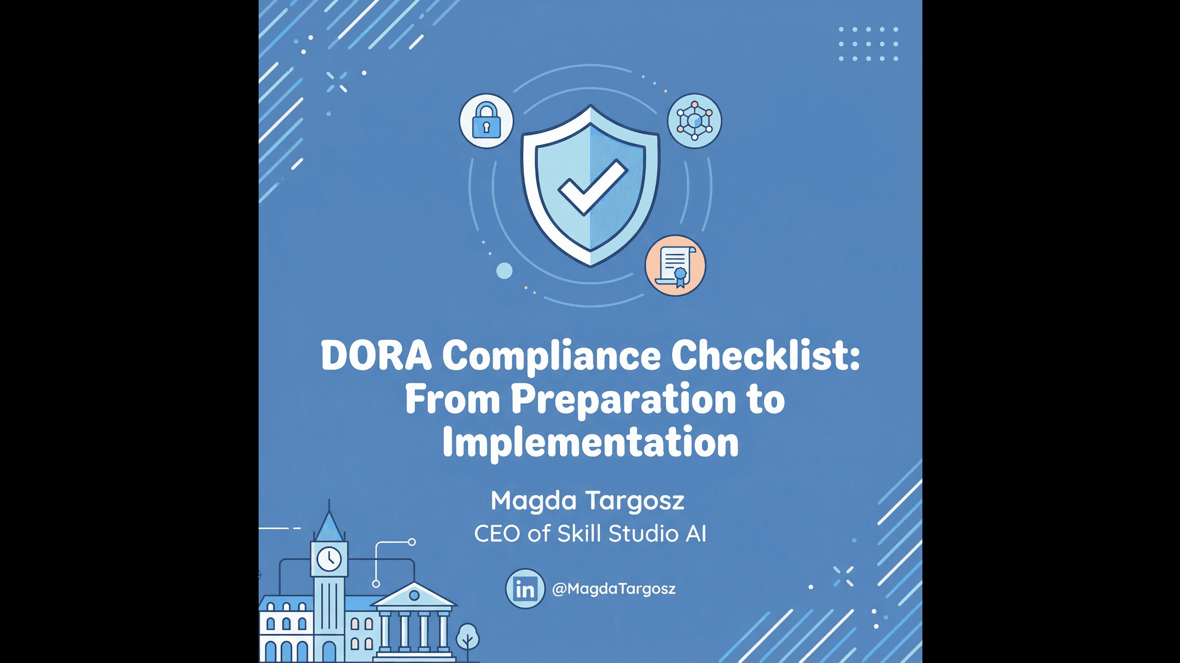 Topics include DORA basics, compliance requirements, implementation steps, and more.