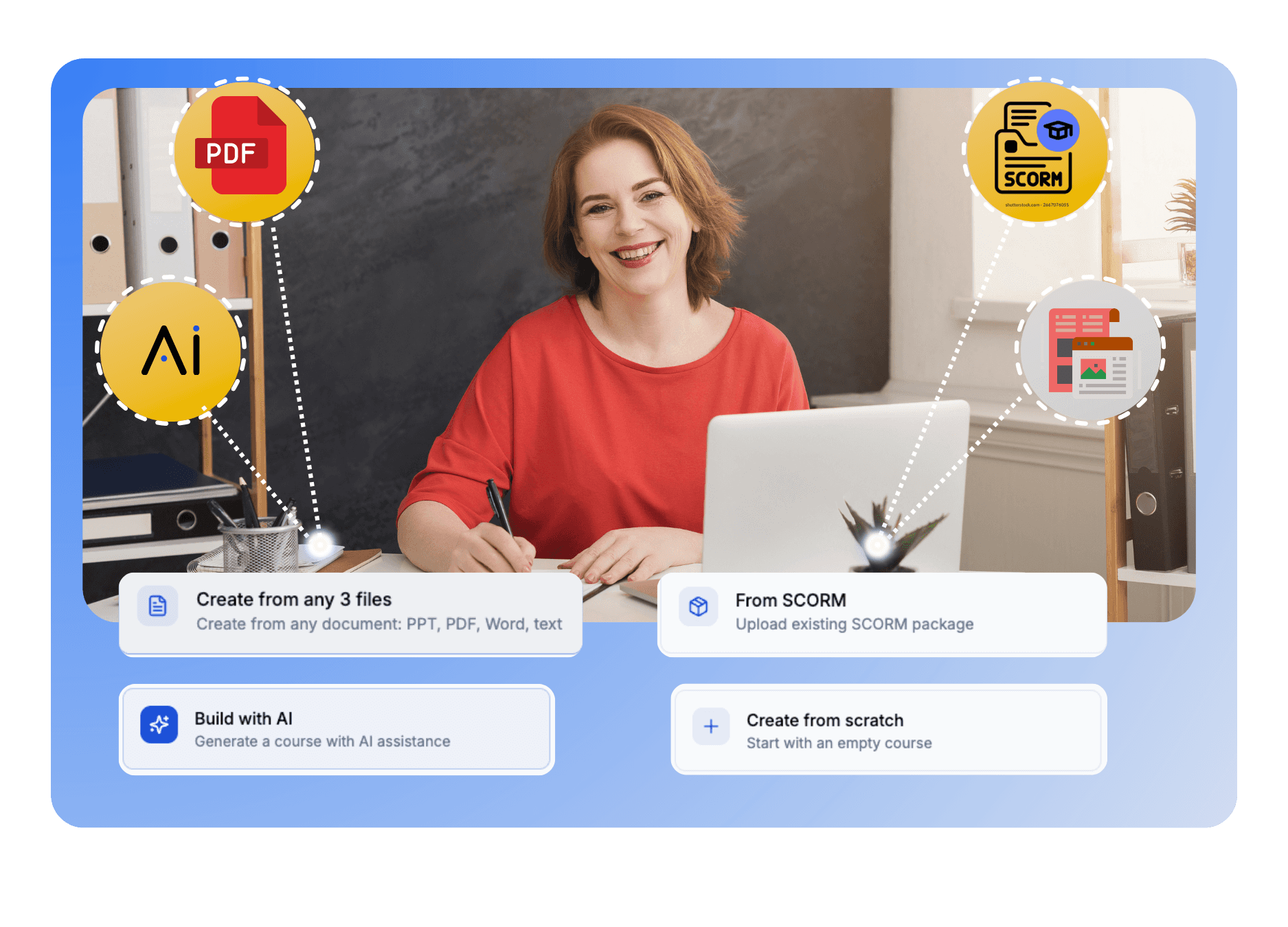 Generate complete courses from PDFs, PowerPoints, or text in minutes. AI creates learning objectives, content, quizzes, and scenarios automatically