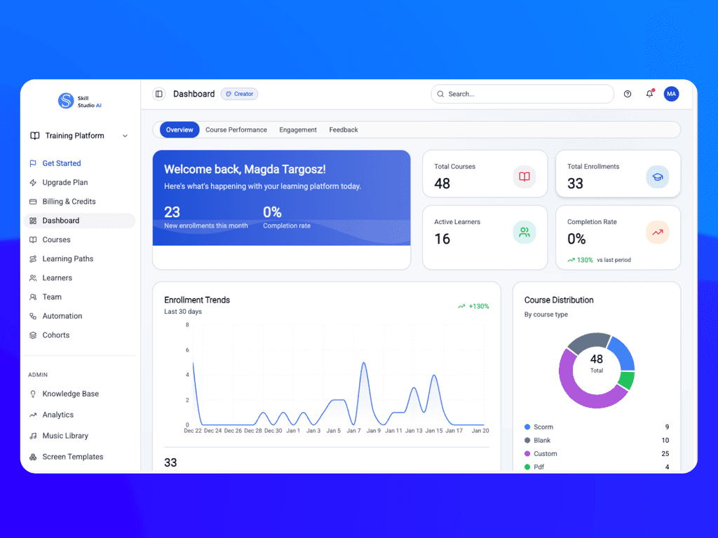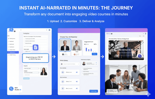 Skill Studio AI gives L&D managers, HR leaders, and compliance teams the power to create enterprise-grade training without complex tools or high costs. Upload your content, let AI do the heavy lifting, and publish to your entire team instantly.
