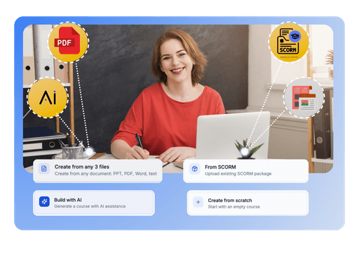 Export as SCORM 1.2 or 2004 to sync with any existing LMS instantly.